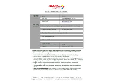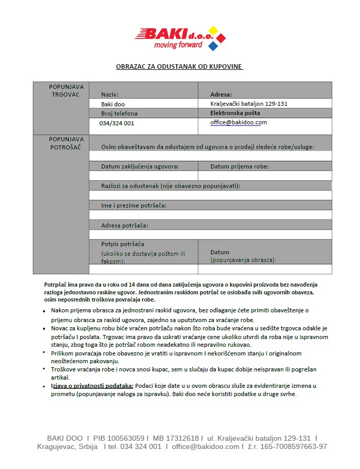 Potrošač može obrazac za odustanak od ugovora dostaviti trgovcu elektronskim putem na e-mail adresu office@bakidoo.com ili na adresu sedišta trgovca: 34000 Kragujevac , ul. Kraljevačkog bataljona 129-131 lično ili putem pošte. Izjava o odustanku od ugovora proizvodi pravno dejstvo od dana kada je poslata trgovcu. U skladu sa čl. 27. st. 5. Zakona, trgovac je dužan da bez odlaganja obavesti potrošača o prijemu obrasca putem elektronske pošte. Protekom roka od 14 (slovima: četrnaest) dana od dana kada je roba dospela u državinu potrošača ili lica koja je on ovlastio za prijem robe prestaje pravo potrošača na odustanak od ugovora.
